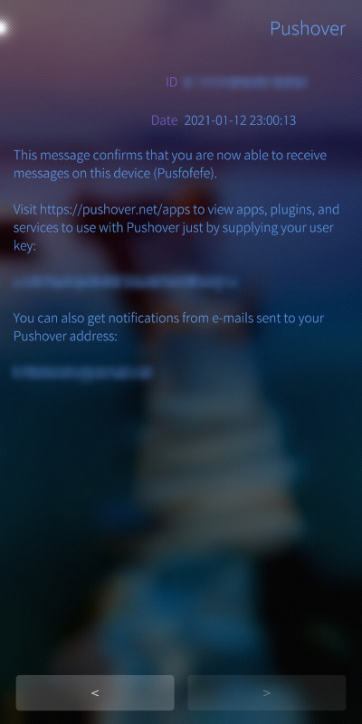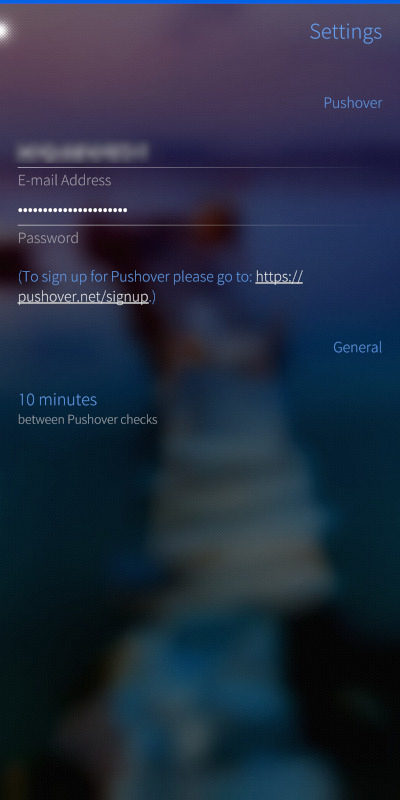 Pushover is a notification service for desktop, Android, iOS and now also Sailfish OS. To paraphrase their website: "Pushover is a service to receive instant push notifications on your phone or tablet from a variety of sources". (For the current version of this app "instant push notifications" is a lie, since it polls every 10 minutes by default.)