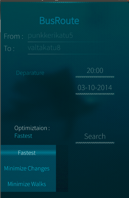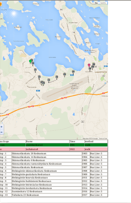 Bus Route asks source and destination from user and gives information about bus service of Lappeenranta such as time of next bus, routes that bus will use for getting to destination and also time duration of getting to destination.
