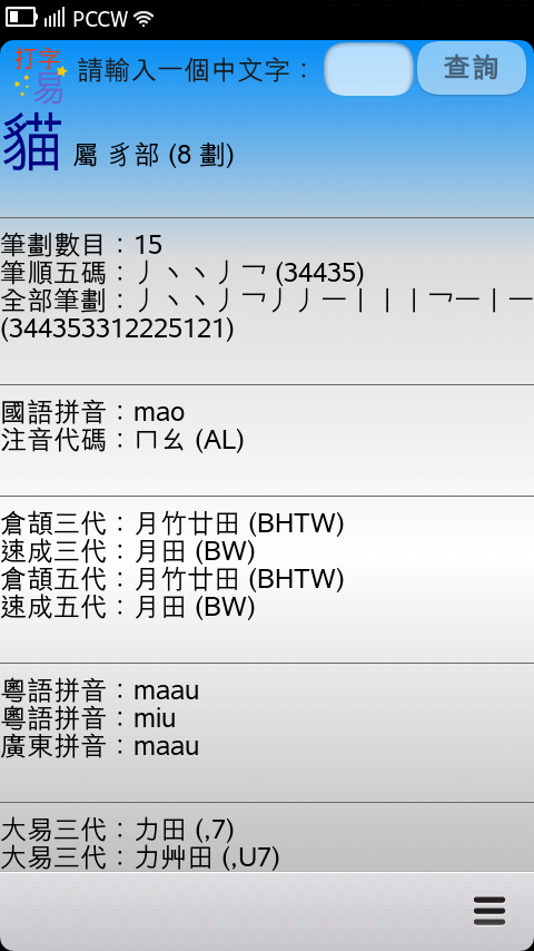 打字易 是一個讓你學習某個中文字於各主流輸入法如何輸入的 N9 / N950 軟件。本軟件的資訊來源來自 SCIM、GCIN、IBus 及 VimIM 等開放源碼計劃的輸入法碼表;部首資料來自 zdic.net 漢典網站。