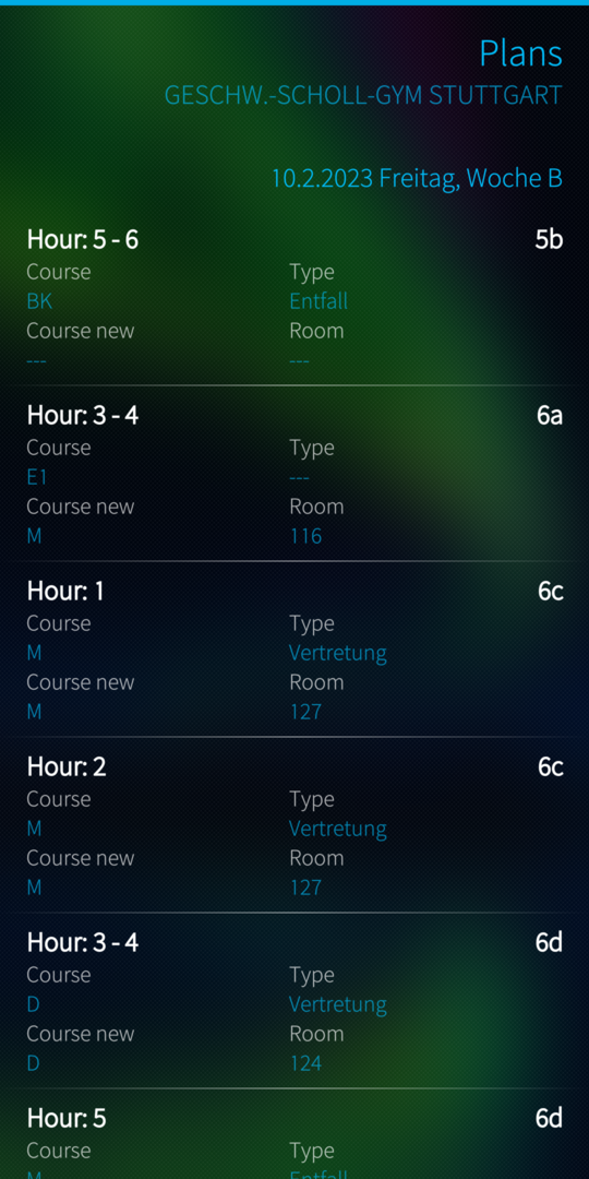 So far the application does only provide the standin plans, since the school my kid visits only provides these information. More could be implemented, but is not planned, as long as the school does not use more features and provides more information.