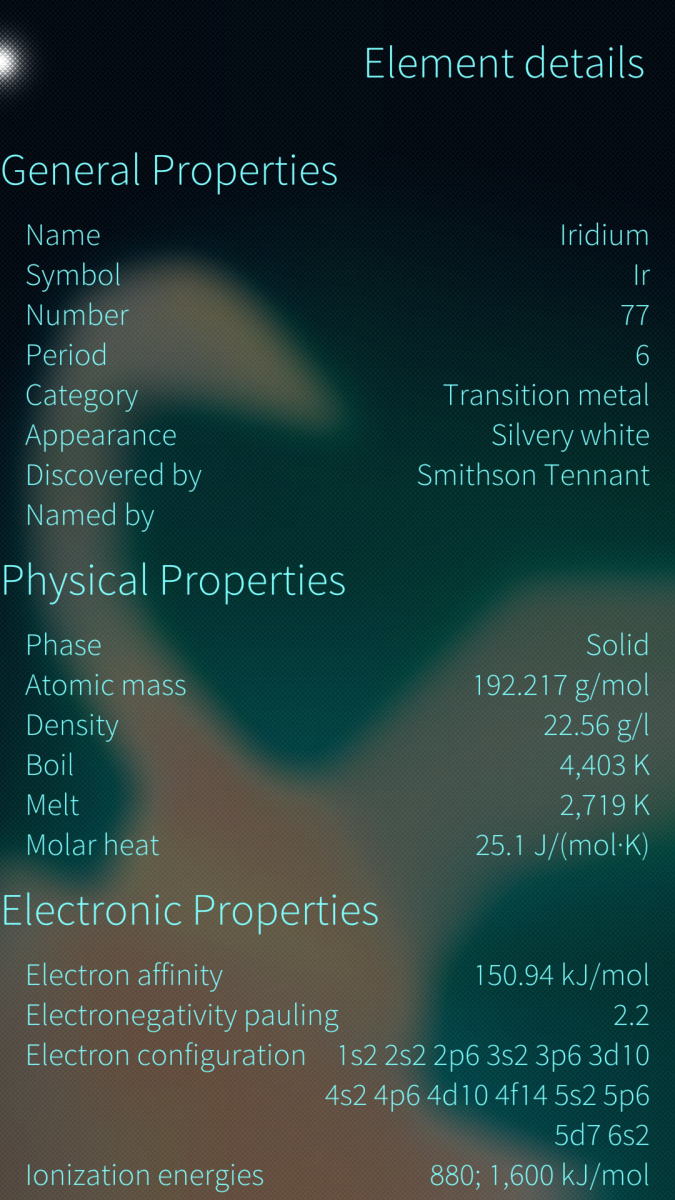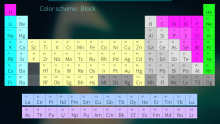 Periodic table for SailfishOS with element properties and different colour schemes.