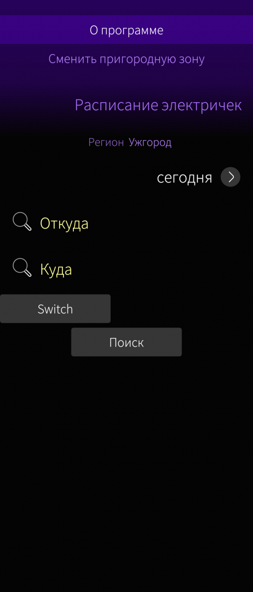 The app shows timetable of Russian and some others suburban trains, using data from Yandex.Rasp.