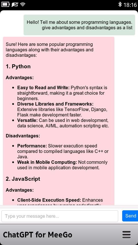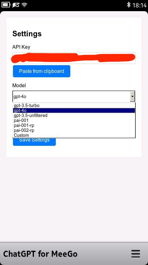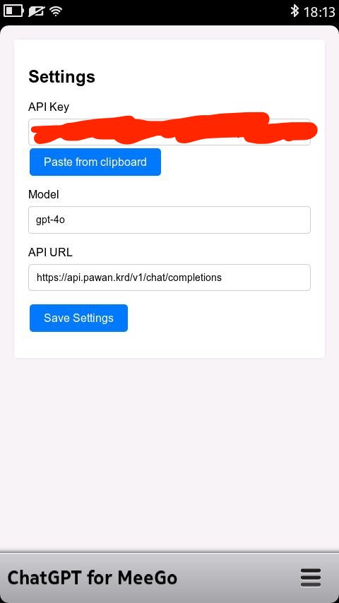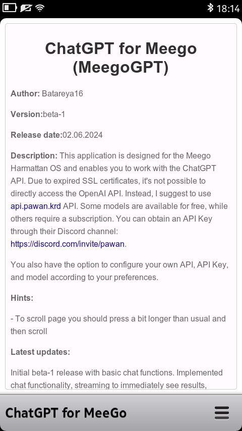 This application is designed for the Meego Harmattan OS and enables you to work with the ChatGPT API. Due to expired SSL certificates, it's not possible to directly access the OpenAI API. Instead, I suggest to use api.pawan.krd API. Some models are available for free, while others require a subscription. You can obtain an API Key through their Discord channel: https://discord.com/invite/pawan.