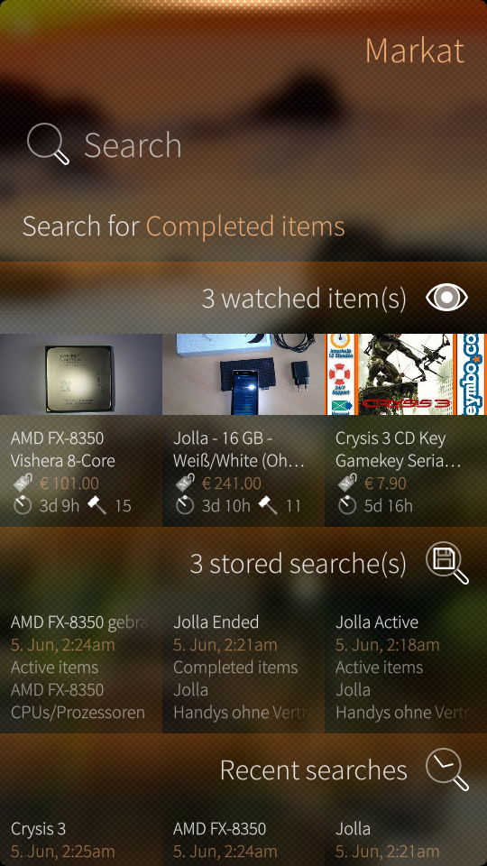 Markat is a native Sailfish OS client for eBay. It can currently browse, search and filter items on the eBay market place, as well as show detailed item information. After authentication it integrates in your MyEbay. Currently it does not provide access to placing bids and order articles, or to create own listings. These are future targets.