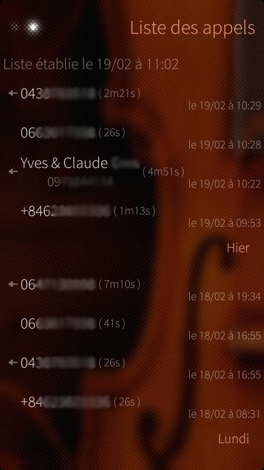 Currently, only the call list is available. The list of calls made through the Freebox is displayed and matching numbers with phone contact displays contact name. Duration and date are also displayed. Selecting an entry in the call log open the contact card or propose to add the number as a new contact or to link it to an existing one as the phone call log application is working.