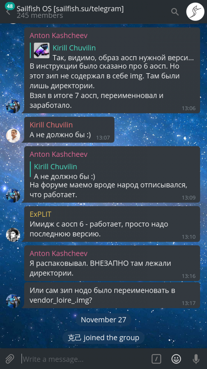 Many bugs in that build, last word of messages always dont send =) i can make a call to contact, and it works, but cant answer to call ) its very slow work, animation in interface is not smooth, low fps... realy some body must complete SailorGramm with all features from TDesktop =)