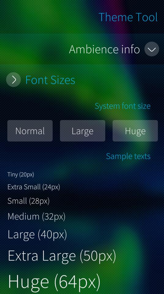 Theme Tool for Sailfish OS is a little handy utility to check out the details of your current ambience. It shows sizes and colors of various elements, and it can also change the system font size - conveniently even from the cover page! It automatically updates its contente whenever ambience change is detected.