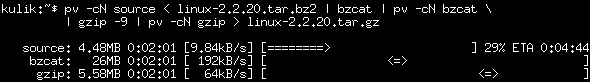PV ("Pipe Viewer") is a terminal-based tool by ivarch for monitoring the progress of data through a pipeline. It can be inserted into any normal pipeline between two processes to give a visual indication of how quickly data is passing through, how long it has taken, how near to completion it is, and an estimate of how long it will be until completion.