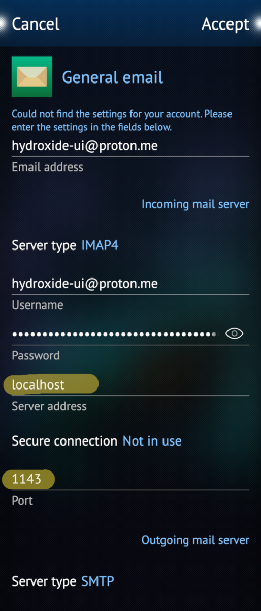 Once the bridge password is generated, you can add your Proton Mail account to Settings → Accounts → Other email using the local bridge.
