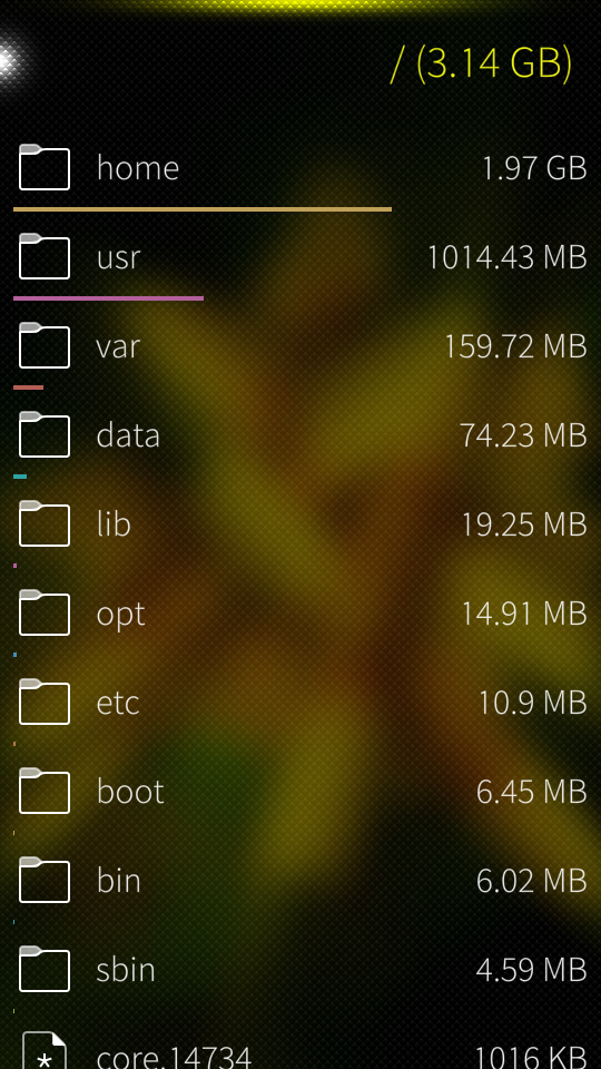 Nice app. It should have shortcuts to all mounted filesystems, though. Now rootfs and sdcard is shown, but /home isn't, for example.