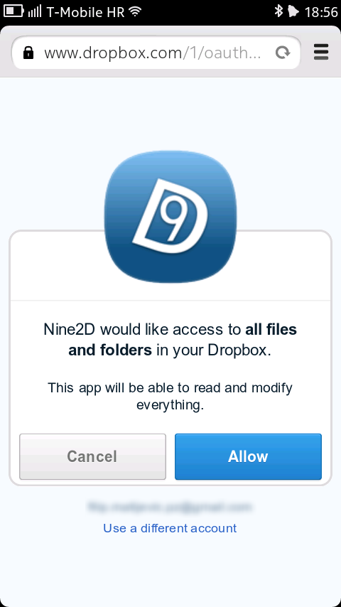 After installation go to Accounts application, click on "Add account" and in the list of account types select Nine2D (after first installation red box is displayed instead of icon - restart is required in order for icon to display correctly). In subsequent window tap on "Authorize application". Web browser is then displayed and there enter email and password (if asked) to connect to to your Dropbox account. Press "Allow" in order to give Nine2D right to access your Dropbox account. When done return to account creation window (web browser can be safely closed) and tap on "Complete authorizing". If everything goes well application closes and you can see new Nine2D account in Accounts application.