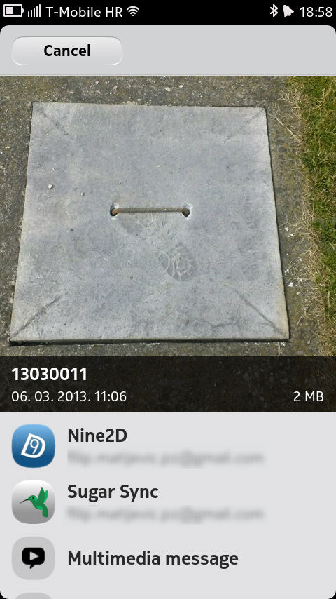 To test upload functionality go to Gallery and select a picture, tap on it and then tap on sharing icon - from list select the Nine2D account and then press on "Share" button. You can monitor progress of upload in the Transfers screen. Finally check whether the picture uploaded correctly in your Dropbox account.
