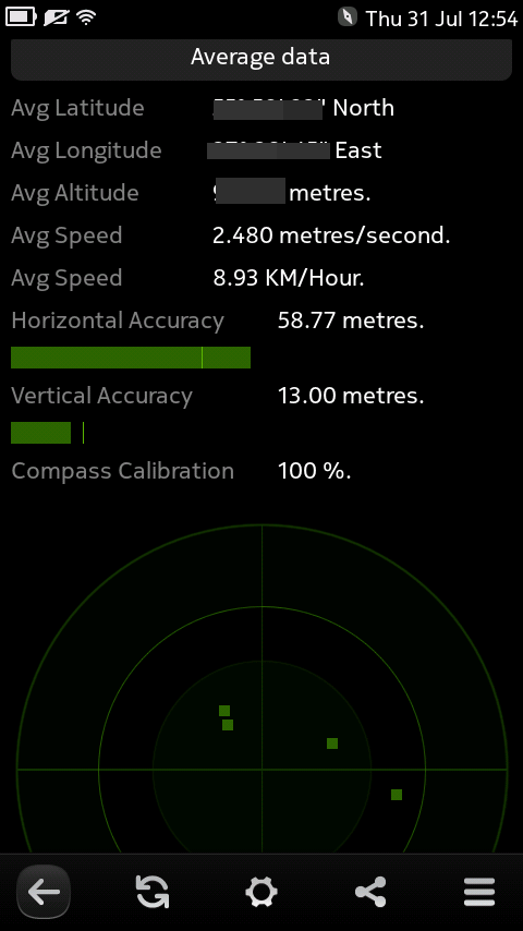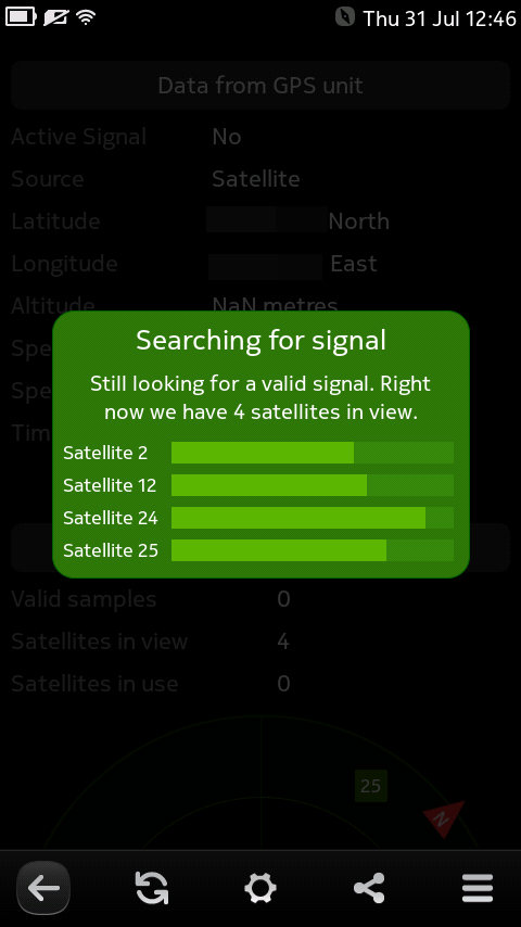 A simple app that shows GPS information that is not normally available. Requires PR1.2+, will not work on PR1.1. After a valid signal is found, it shows your current position and average position, satellites in use and view. Along with showing signal strength there is an option to map your position via Nokia Maps.