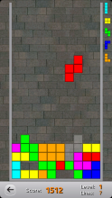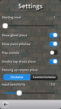 Traditional falling pieces game. Your goal is to align falling pieces so that they form full lines, which then disappear and give you points. Clearing several lines simultaneously increases earned points. Panning left/right moves the falling piece, panning up/down rotates it. Touching the screen with two fingers speeds up the falling movement and swiping down in this accelerated state drops the piece.