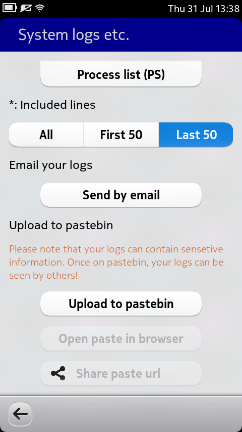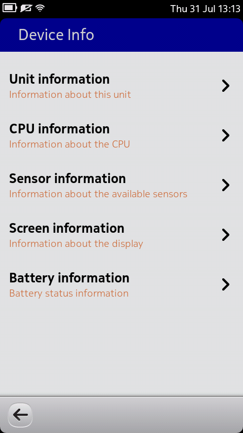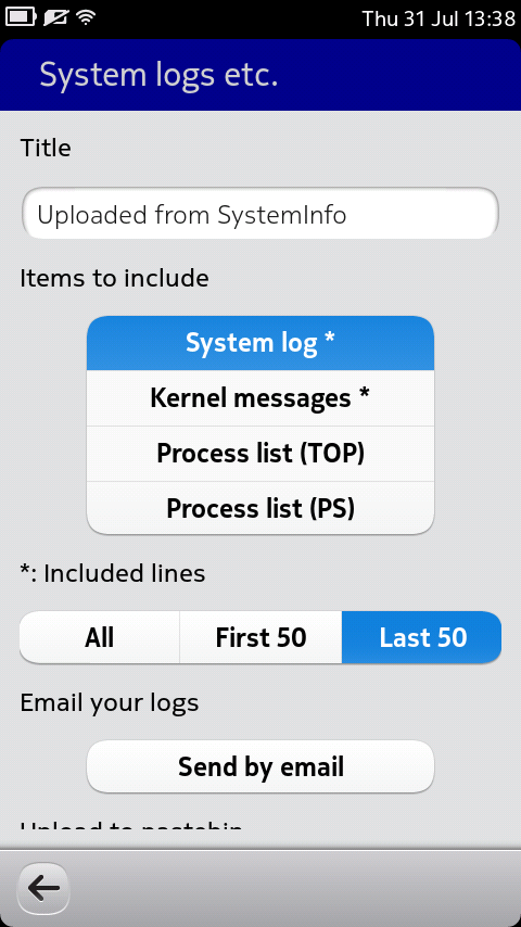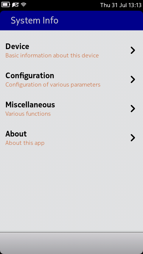 SystemInfo is utility for examining various aspects of your Harmattan phone, for example to find out your CPU type, available memory or installed QML packages. It is primarily targeted to developers, but some functions such as "upload logs to pastebin.com" can also be of much use to normal users.