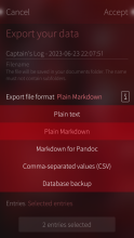 If you want to backup your diary, you can simply copy the database and put it back later. Copy these two files (both! - or the whole folder):/home/defaultuser/.local/share/harbour-captains-log/harbour-captains-log/logbook.db/home/defaultuser/.local/share/harbour-captains-log/harbour-captains-log/schema_versionYou may have to replace "defaultuser" by "nemo". When using File Browser, you can tap the burger menu icon and select "edit path", then enter the path.ichthyosaurus