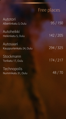Sailfish app which displays number of free places at parking halls in Oulu.