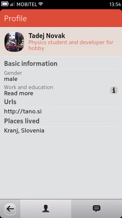 MeePlus is a Google+ client for Nokia N9 and N950. MeePlus uses official Google+ API to display all relevant information. Currently it is in an early stage of development so it only supports people profiles with posts and people search at the moment. Source and bug tracker: https://github.com/ntadej/MeePlus