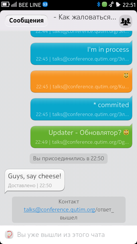 Multi-user chats support for Harmattan — jabber conferences and other MUCs are perfectly integrated into the system interface. Source: https://code.launchpad.net/~torkvemada/+junk/harmmucs