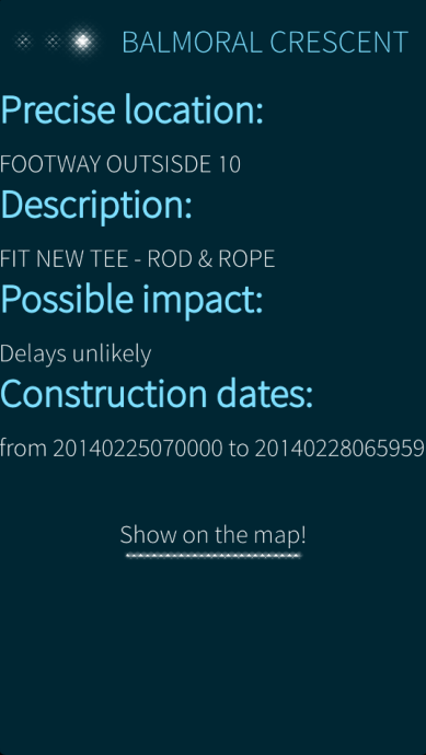 In a bustling city such as Nottingham, a lot of road maintenance is necessary to keep things running smoothly on the roads and highways. Fore knowledge of these maintenance works could save a lot of time for busy city dwellers. We have designed our app to help navigate the city more efficiently by avoiding these repair sites when possible or take into account the delay when not possible so that destinations are reached safer and faster. The application also allows users to find available parking spaces in the city conveniently on their phones. We have done these by integrating both the UK government's available open data for Nottingham and Google maps.