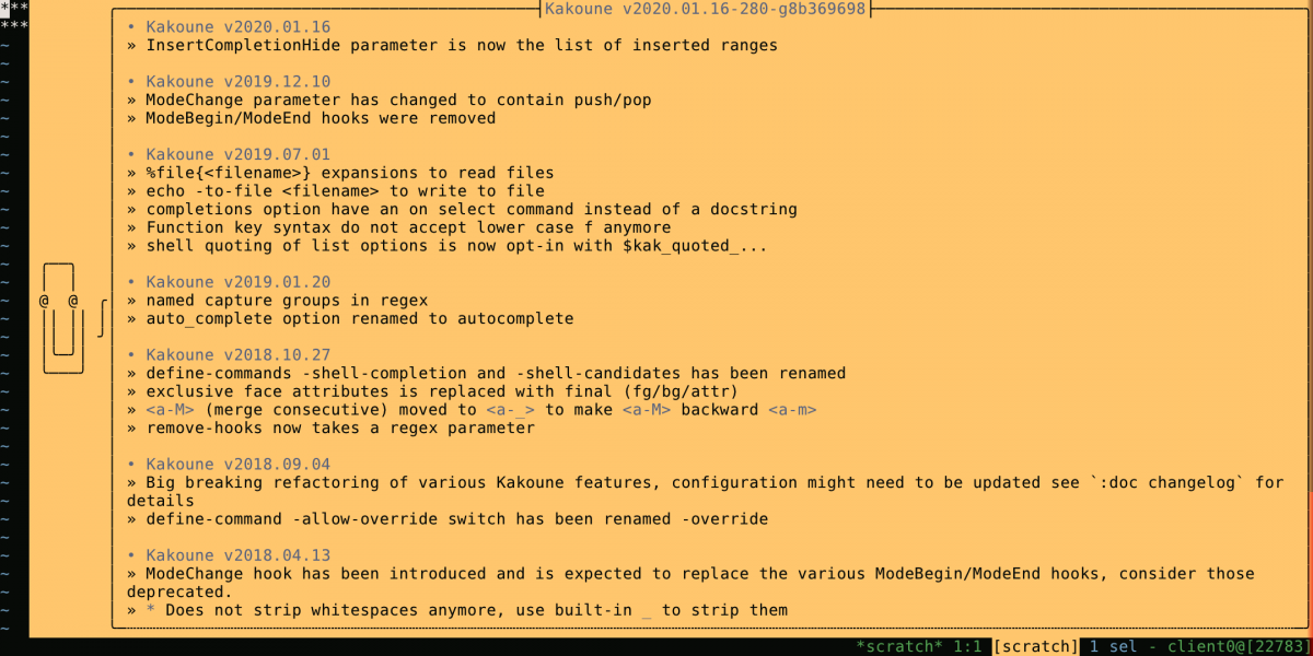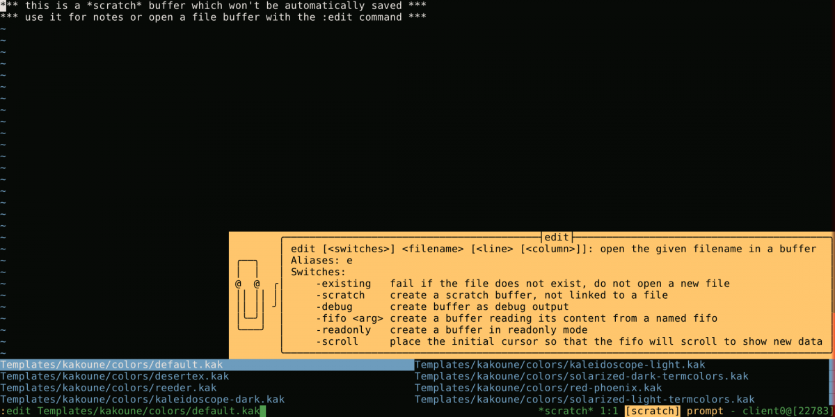 • Kakoune implements several tools to help editing/writing text: contextual help, as-you-type completion, syntax highlighting for several programming languages…