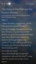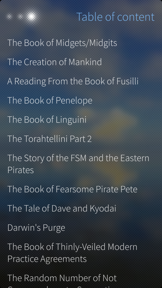 The holy book of FSM, is a collenction of apocrypha writings, describing the adventures of the FSM and it's chosen people, found on the internet under the name Loose Canon.
