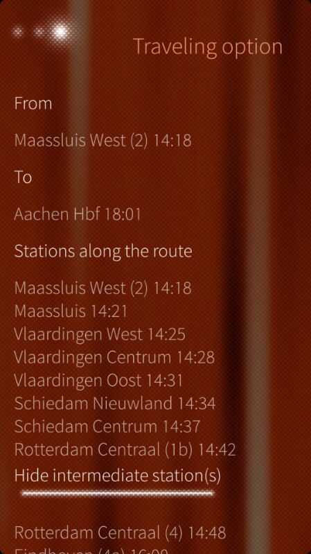 This is a trip planner for users of the Train in the Netherlands. It retreives information from the NS (Dutch Railways), but will also show some information on trains from other transporters, even limited trains in Germany, Belgium etc.