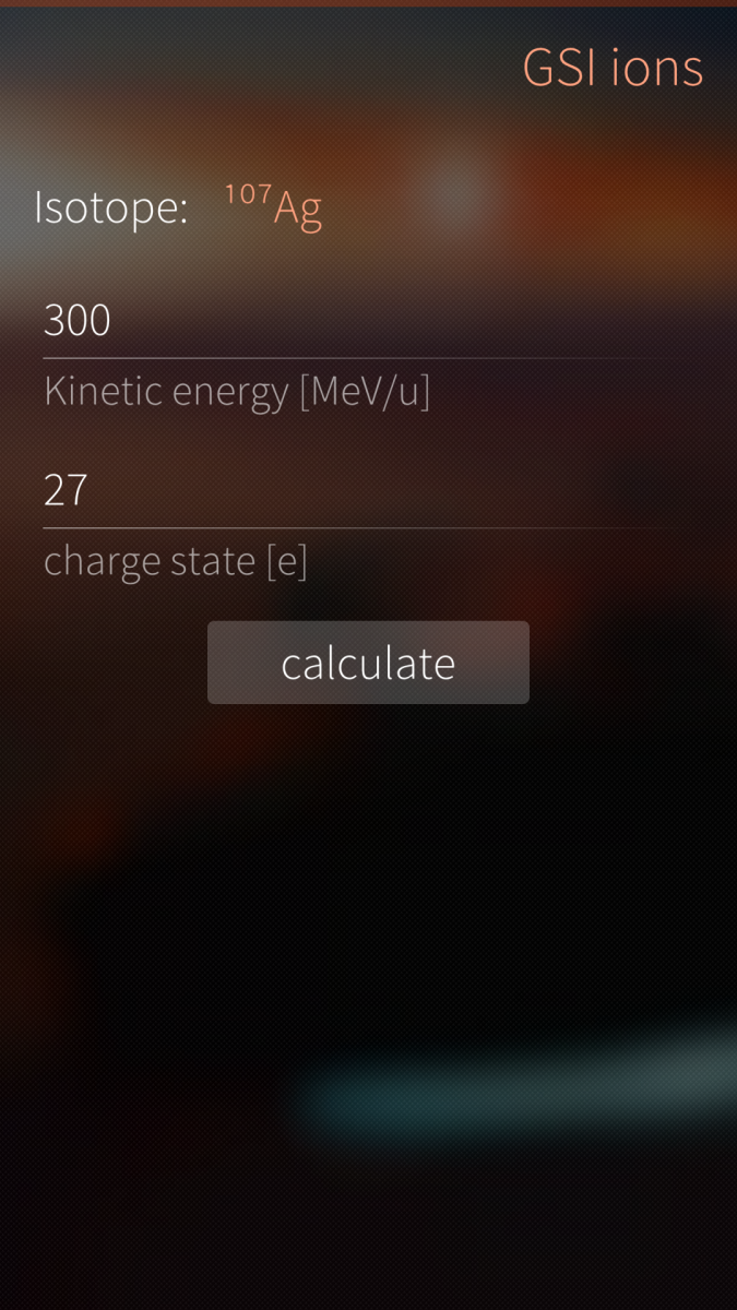 This is a very simple application which calculates relativistic beta and gamma factors, magnetic rigidity and some other properties of ion beams. The input is isotope type, kinetic energy per nucleon and charge state. Application name - Gion - stands for GSI ions. GSI is one of labolatories where this simple calculation has to be done on daily basis.