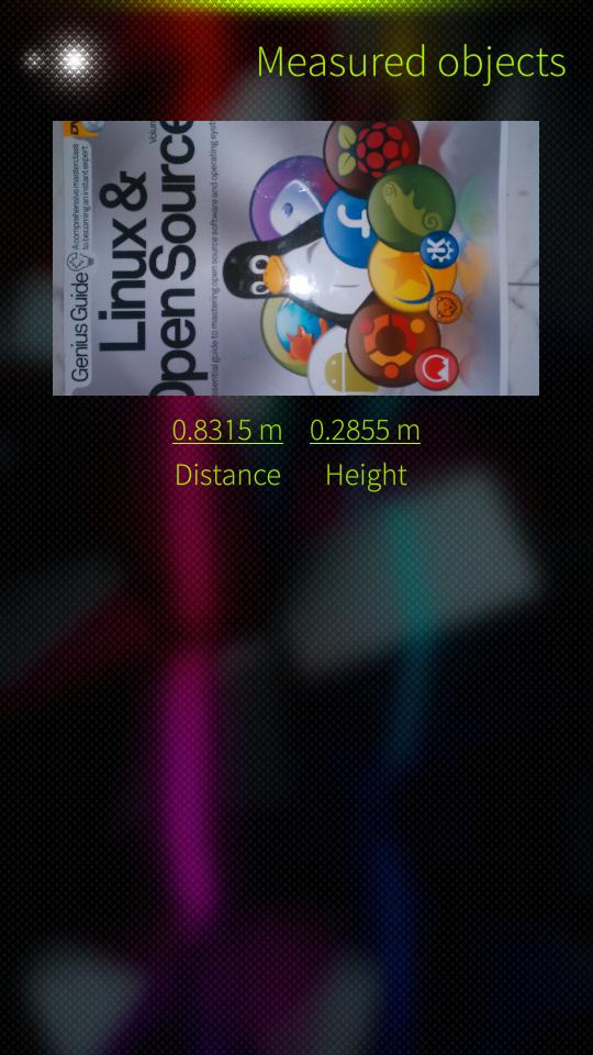 - User can take a picture of an object for later use. Pictures can seen under See measurements MenuItem.