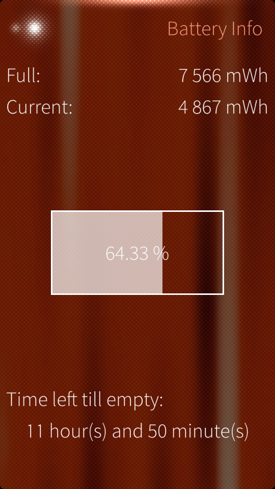 And one other thing: I realised that your app sometimes gives different battery percentage than the Jolla does itself. E.g. currently Jolla say 90%, but your app says 99,25% which comes from the fact, that nominal full capacity is 7236 mWh and current measures 7182 mWh. Because the real full battery is probably above the nominal capacity. From Jollas calculation it seems that full capacity of my battery currently is 7980 mWh.