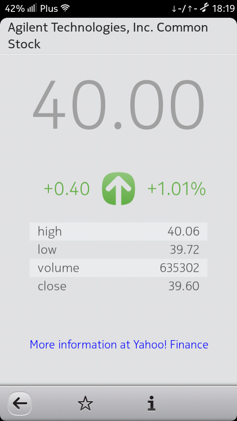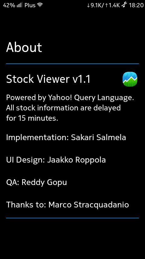 Application for viewing stocks traded in NASDAQ, NYSE, NYSE AMEX, NYSE ARCA and CBOE Stock Exchanges. Stock information is provided by Yahoo! Finance via Yahoo! Query Language. All stock quotes are delayed for 15 minutes. The application consist on 3 views. All stocks view, where traded stock can be searched. Detailed stock view, where user can view individual stock information. Favourite view, where stocks marked as favourite are displayed with current price and change percent.
