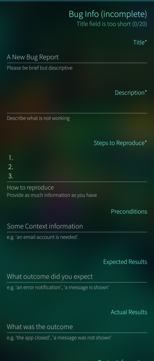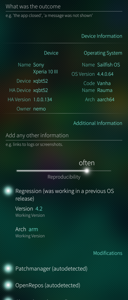 A little tool to assist reporting bugs on https://forum.sailfishos.org, following a more or less standardized template.