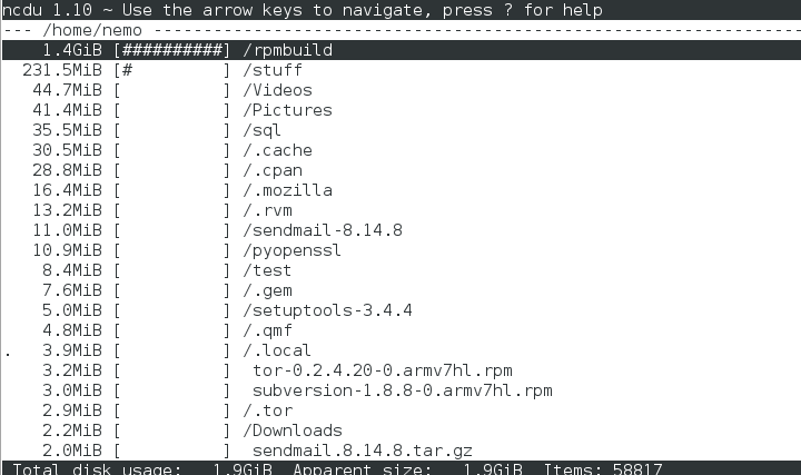 Not quite happy with the available disk usage analyzers and looking for a fun project to get used to C programming, I started working on ncdu: A disk usage analyzer with an ncurses interface, aimed to be run on a remote server where you don't have an entire gaphical setup, but have to do with a simple SSH connection. ncdu aims to be fast, simple and easy to use, and should be able to run in any minimal POSIX-like environment with ncurses installed.
