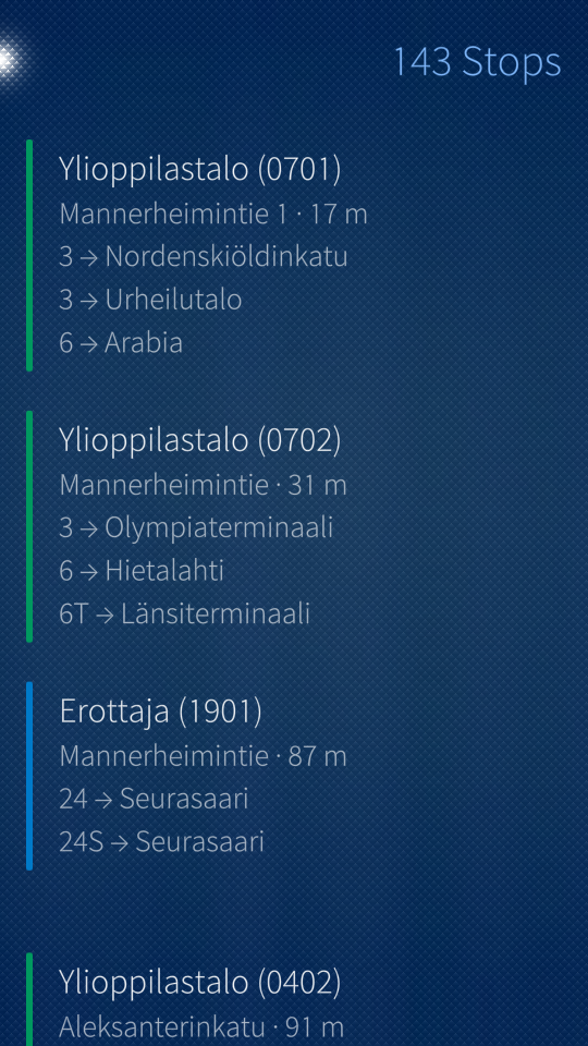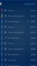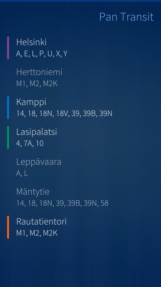 Pan Transit is an application for Sailfish OS to view departures from public transport stops. It is designed to support multiple different providers (i.e. cities/regions). Currently supported are Helsinki Region Transport (HSL), Finnish Transport Agency, Transport for London and ASEAG in Aachen, Germany.
