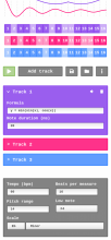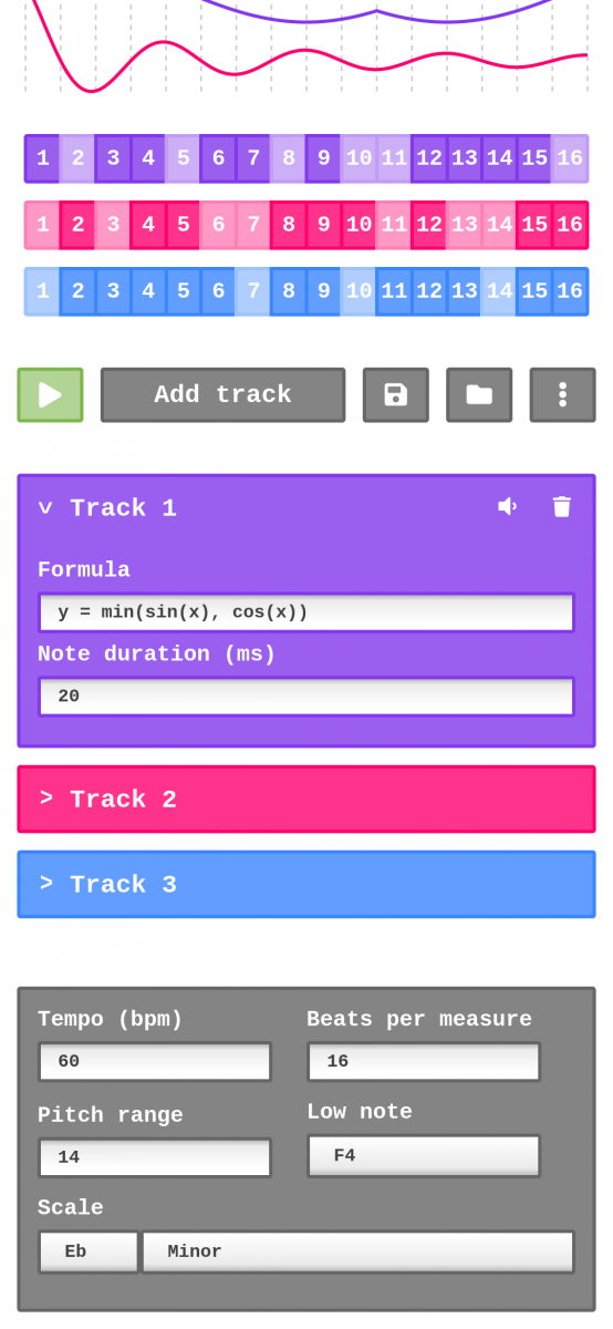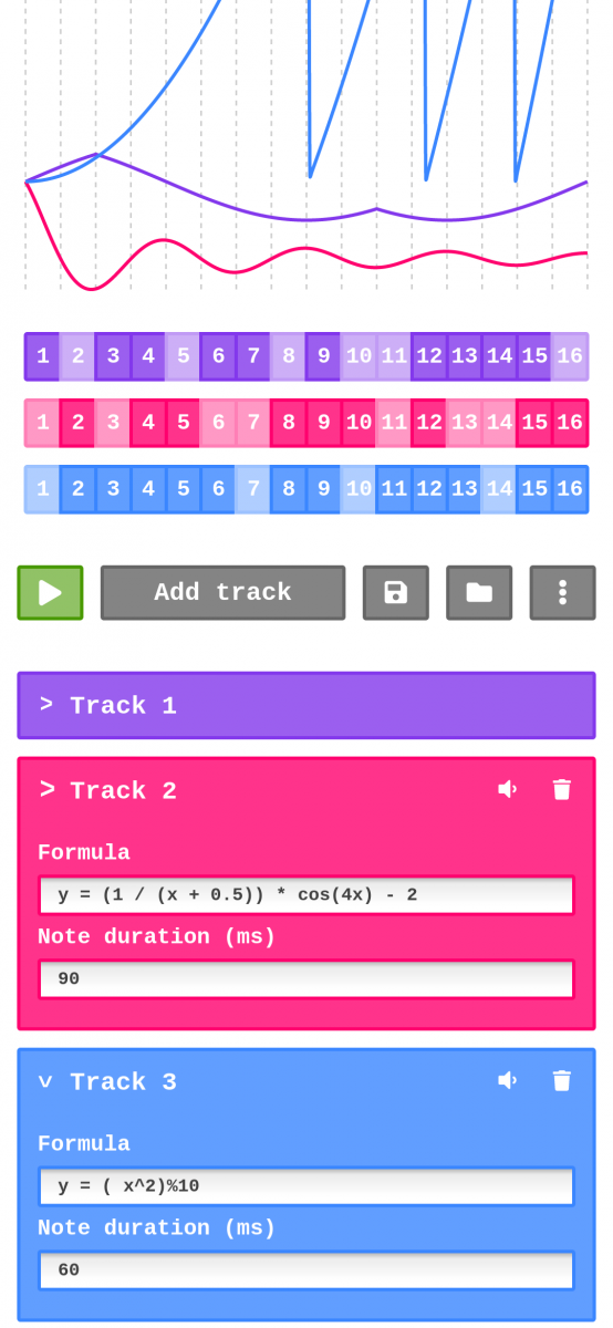 You define tracks with a mathematical formula to plot x/y which is then played given other parameters such as Scale, tempo, etc. The compositions can be saved to midi.