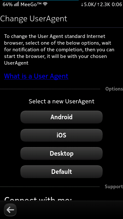 Easy to change the User Agent standard Internet browser, select one of the below options, wait for notification of the completion, then you can start the browser, it will be with your chosen UserAgent. After installing the applet will appear in the "settings app" Attention: Only for Open Mode users!