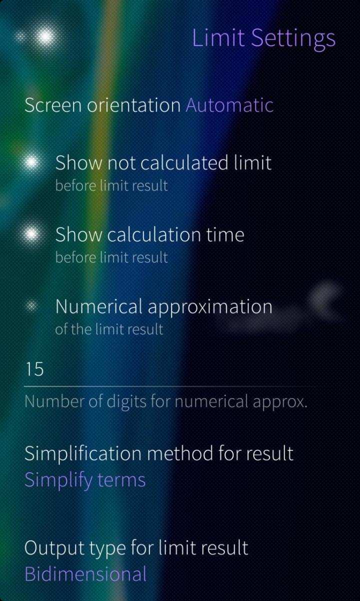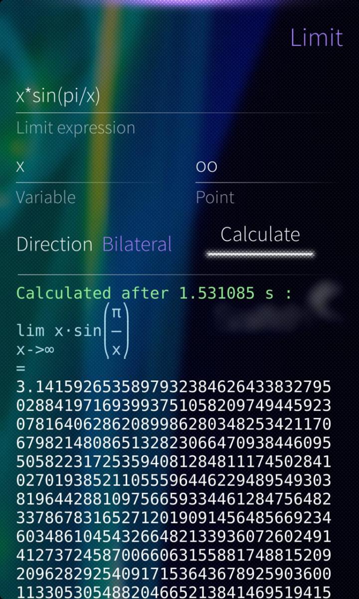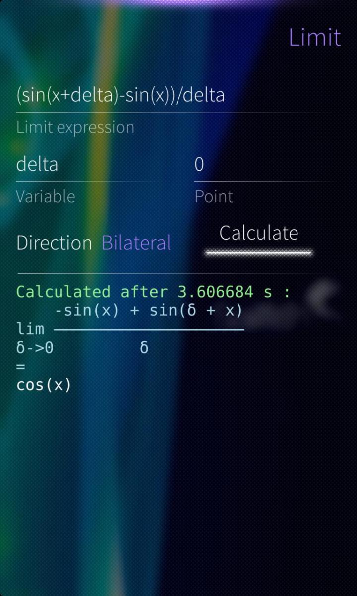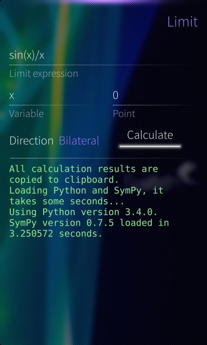 Limit calculations use SymPy, a computer algebra system (CAS) written in pure Python, free and open source project. SymPy for Sailfish is also available.