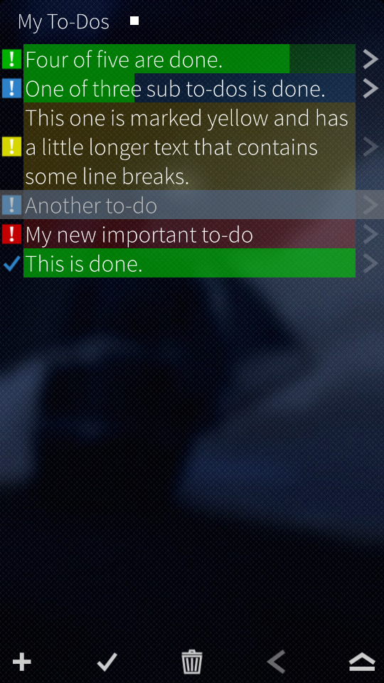 Q To-Do allows you to maintain nested to-dos and notes. You can indicate the importance of a to-do via four colors, edit to-dos and notes, and mark to-dos as done. A progress bar shows a summary about nested to-dos.