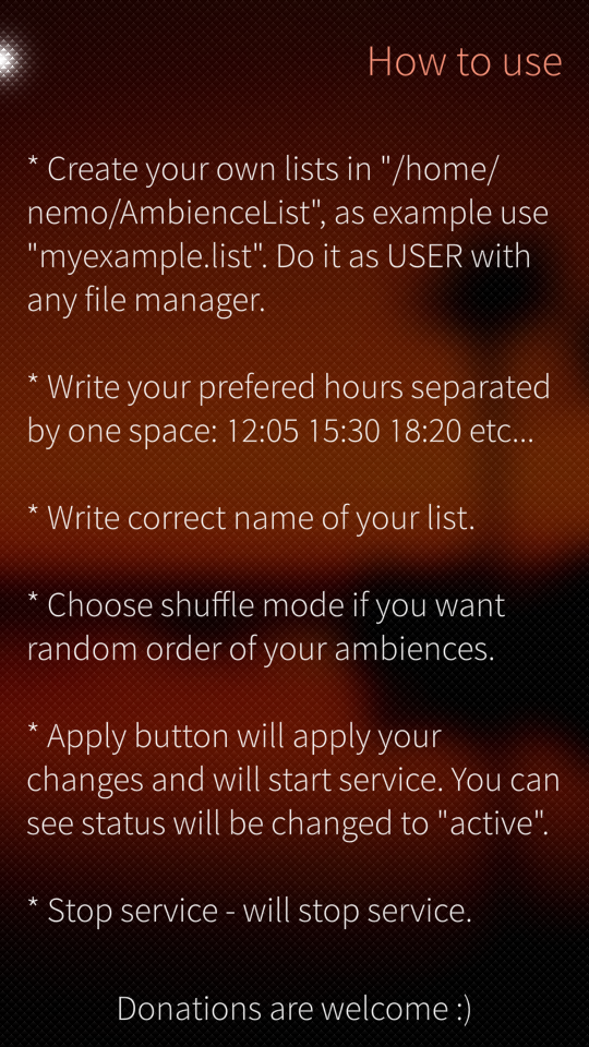 Before you start service, create your own lists in /home/nemo/AmbienceList. Use my myexample.list as example or just use this list if your want. This list contains all your available ambiences.