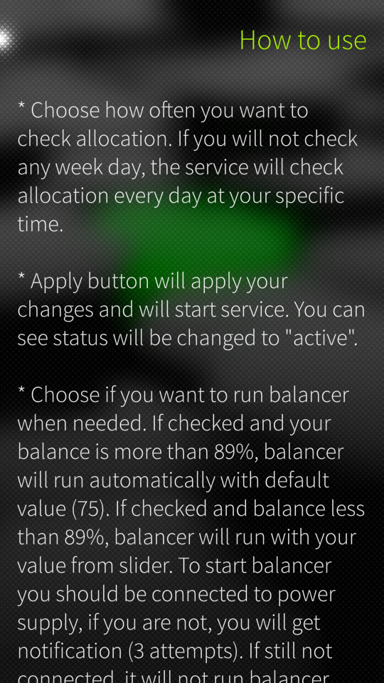 Run balancer when needed - choose if you want to run balancer when needed. If checked and your balance is more than 89%, balancer will run automatically with default value (75). If checked and balance less than 89%, balancer will run with your value from slider. To start balancer you should be connected to power supply, if you are not, you will get notification (3 attempts). If still not connected, it will not run balancer. For checking this parameter and changing slider value, you DON'T need to press Apply button, you can do it whenever you want.
