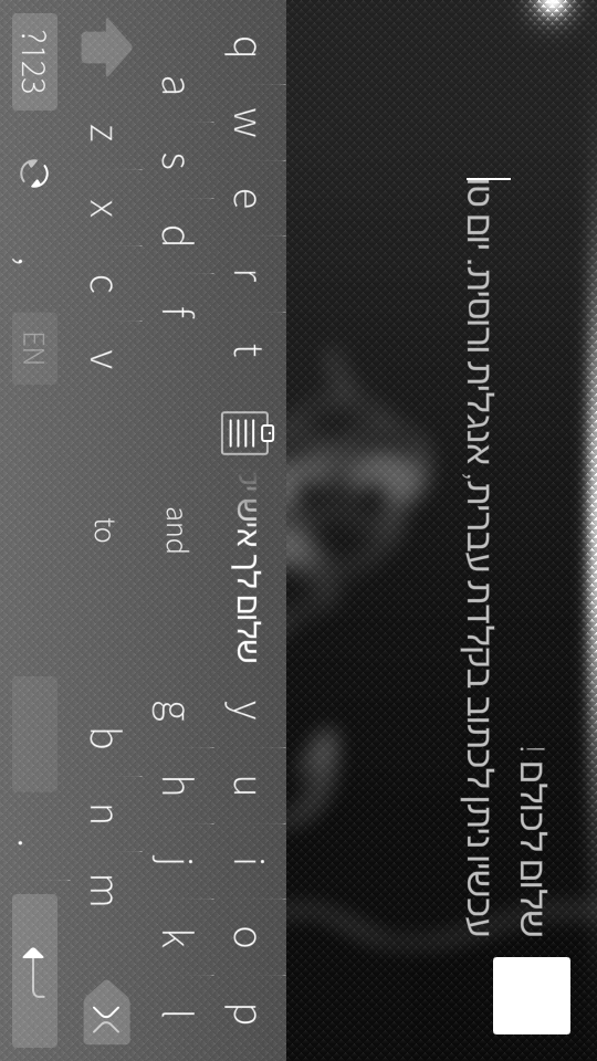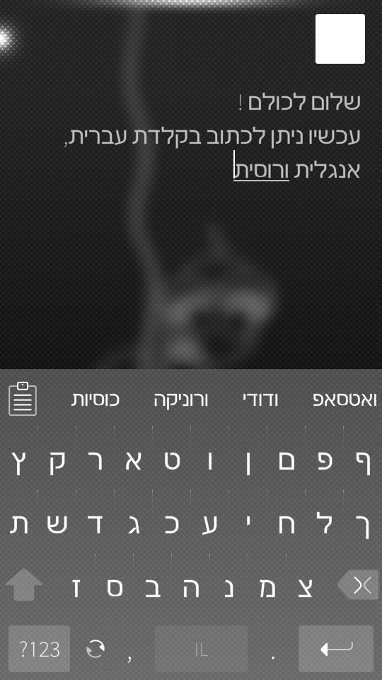 This is Hebrew virtual keyboard with toggle for switching between English, Hebrew and Russian languages. Supported splitted keyboard for landscape mode. Compatible with 1.1.9.28