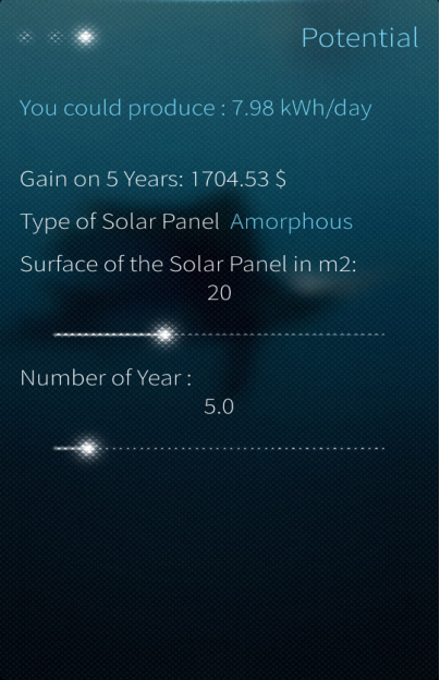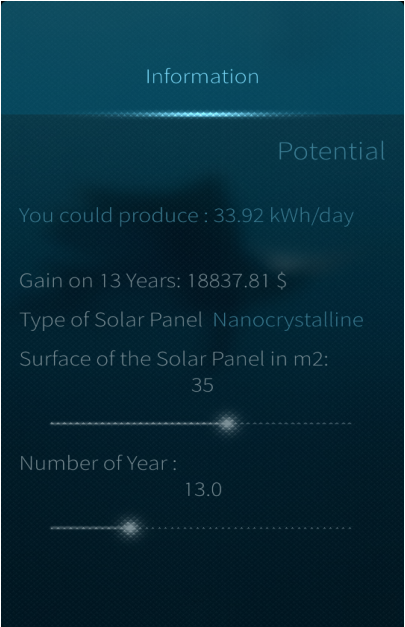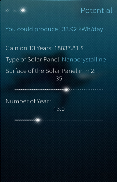 SunPower application is a simple tool to evaluate your own solar potential in order to realize that nowadays, we have the technology to use sun power for home use effectively not only at the desert ! SunPower aims to be ergonomic, easy to use and understandable by everyone. SunPower is not a professional tool but can help to take a decision about the installation of photovoltaic panels for home.