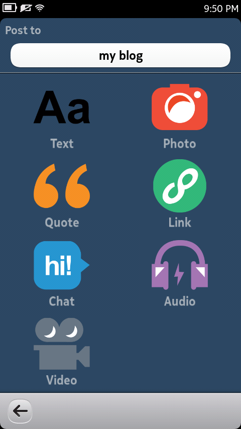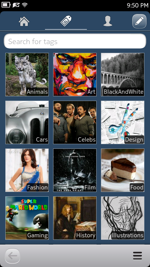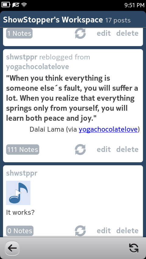 Bumblr is a beatiful Qt/QML based Tumblr app for N9, N950. It supports almost all the features that are provided by current Tumblr public API i.e., posting, reblog, editing, like-unlike follow-unfollow, tag search, etc.