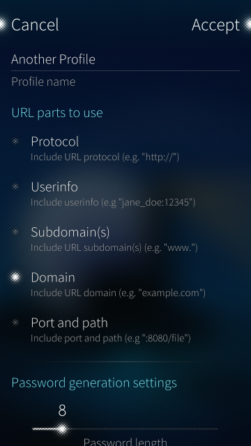 In order to generate a password, one needs to set up a generation profile, and supply a master password and a text to use. The text to use can either be extracted from a URL according to the settings of the current password generation profile, or entered directly.