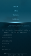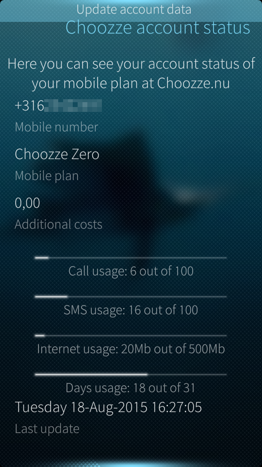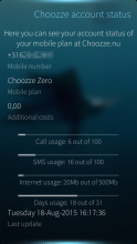 Choozze.nu mobile phone plan and account status. It retrieves the current account status and settings for voicemail and call forwarding. It allows also to change the voicemail and callforwarding settings.