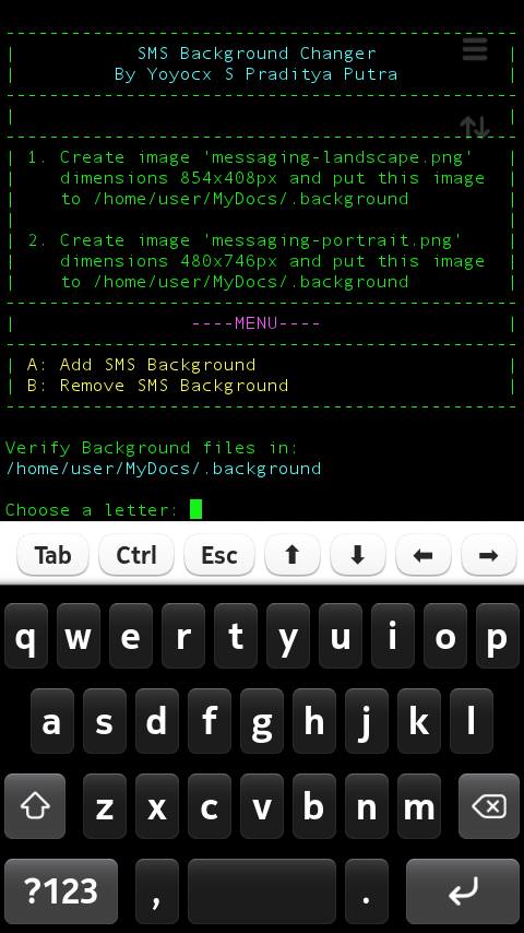 Put your background image named messaging-portrait.png (480x746px) and messaging-landscape.png (854x408px) to /home/user/MyDocs/.background.
